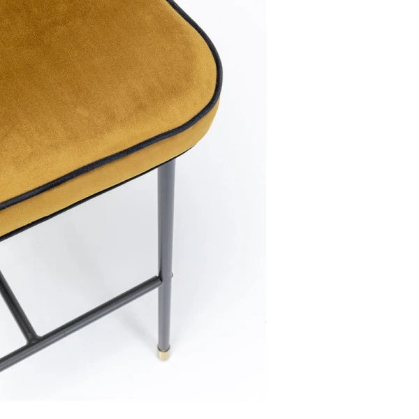 De Kare Design Stavanger barstoel heeft een fluwelen zitting in een okergele tint die neigt naar goud. Samen met de messing voetjes zorgt dit voor een chique, retro effect! Zwarte lijnen in de okergele zitting benadrukken het elegante design van de barstoel. Kijk ook eens naar de bijpassende, fluwelen Irina eetkamerstoel.