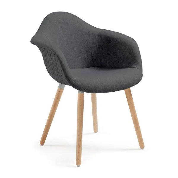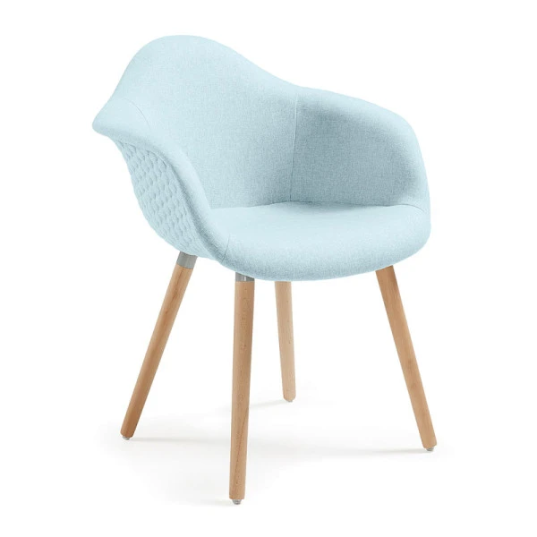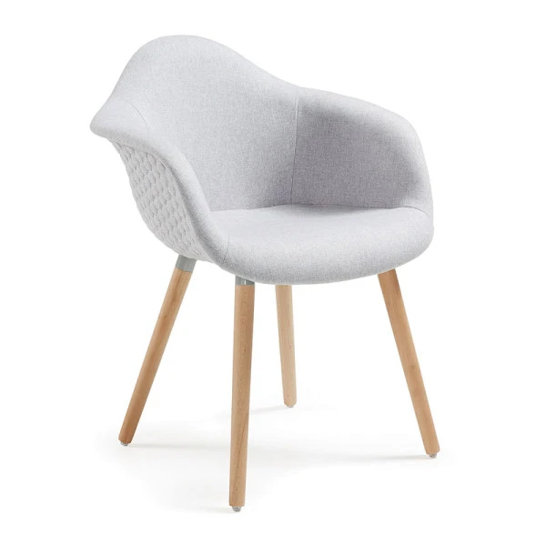 De Kave Home Kevya eetkamerstoel heeft het allemaal: een modern design, sfeervolle poten, een speels patroon in de zitting en een comfortabele kuip! Deze eetkamerstoel van stof is verkrijgbaar in de kleuren lichtgrijs, donkergrijs en lichtblauw. Dankzij de houten poten gaat de eetkamerstoel erg mooi samen met een naturel houten eettafel in een Scandinavisch design.