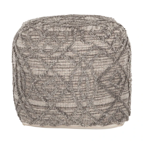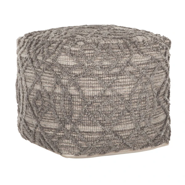 - Zachte, vierkante poef met een mix van kleuren en patronen