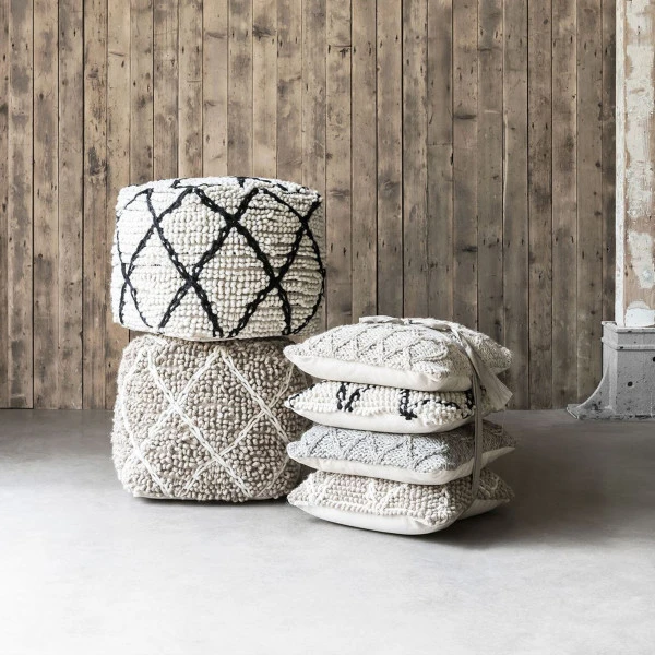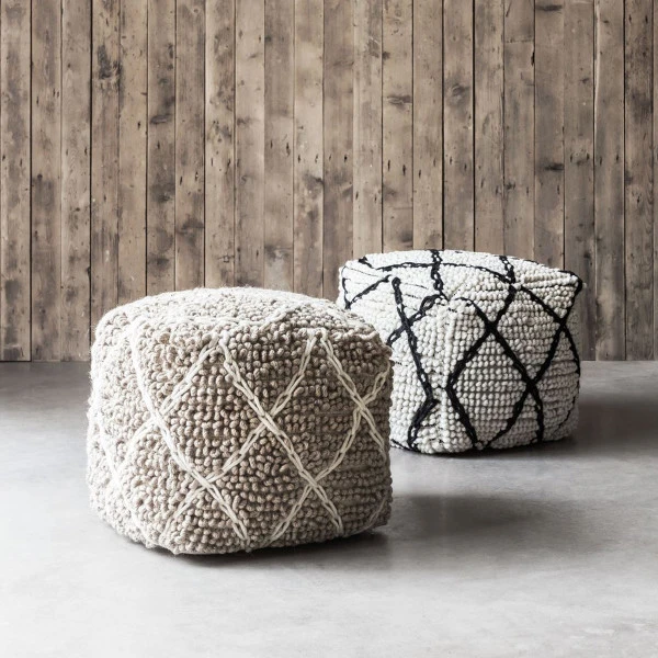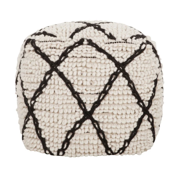 - Vierkante poef van wol met een ruitpatroon